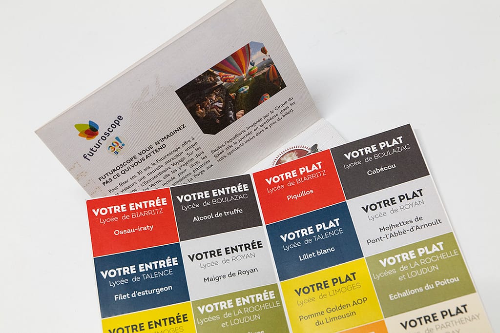 L’objectif était d’inviter les convives à goûter à l’ensemble des bouchées proposées sur les buffets et leur permettre de repartir avec un document souvenir contenant la présentation de l’événement, des lycées participants et de recettes.
