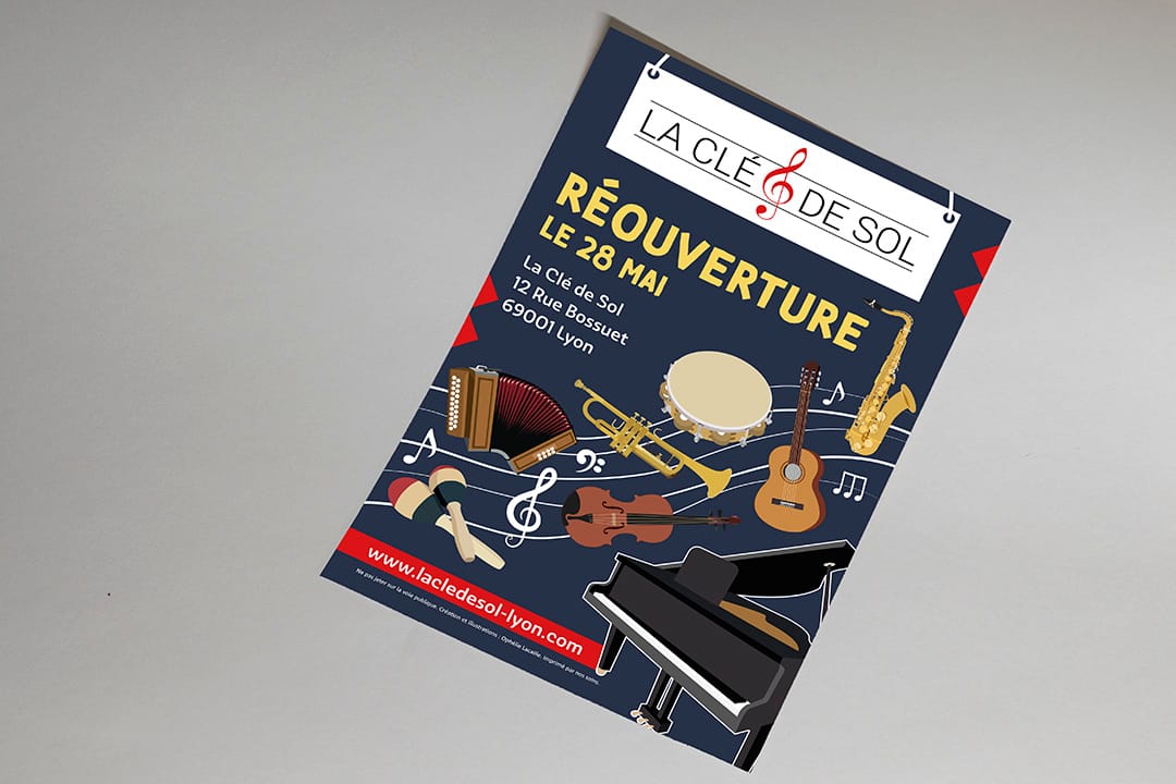 Réaliser la mise en page et les illustrations d’un flyer pour la réouverture d’un magasin d’instruments de musique.